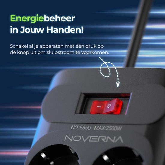De stekkerdoos van Noverna is niet alleen een veilige haven voor al jouw laadbehoeften, maar ook toonbeeld van praktisch design. Een handige schakelaar helpt bij het voorkomen van sluipverbruik, terwijl de twee meter lange kabel en het anti-slip ontwerp ervoor zorgen dat jij de stekkerdoos eenvoudig en stabiel kunt plaatsen, waar je maar wilt. Ideaal voor iedereen die zowel thuis als op kantoor op zoek is naar een duurzame en betrouwbare laadoplossing.